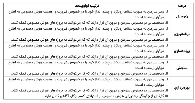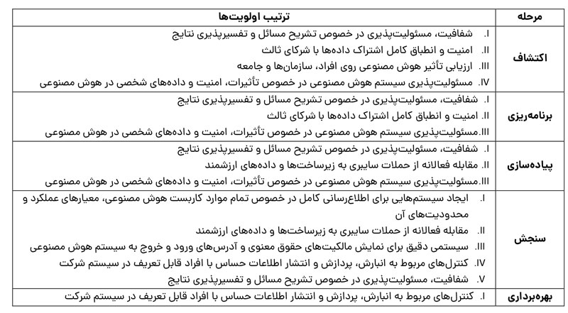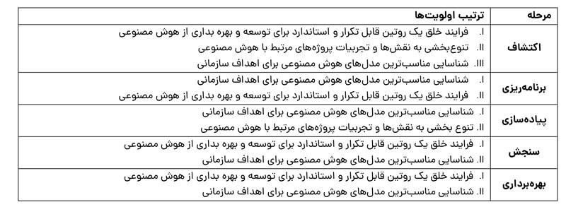 خلاصه بخش دوم این گزارش به شرح جدول شماره 8 است. در این بخش، بیان شده که در هر کدام از مراحل مسیر ارزشآفرینی از طریق هوش مصنوعی که قرار دارید، کدام اولویتها برای سازمان شما میتواند به کار بیاید.