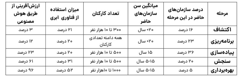 جدول 7. ویژگیهای شرکتهایی که در هر کدام از مراحل رشد هوش مصنوعی قرار داشتهاند