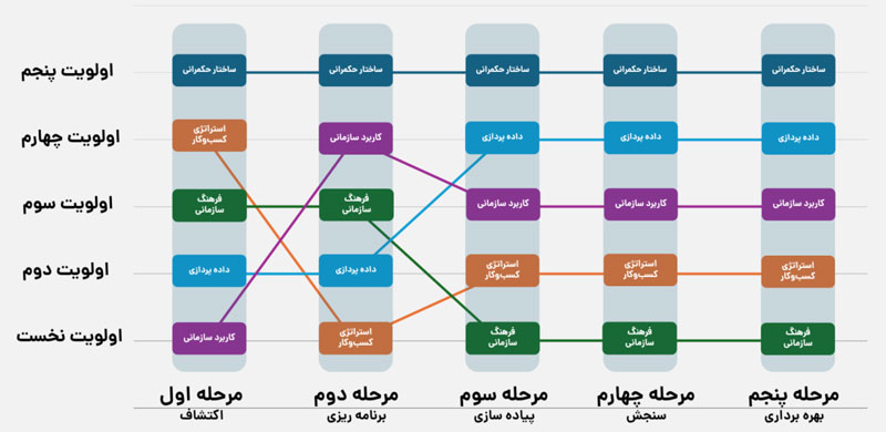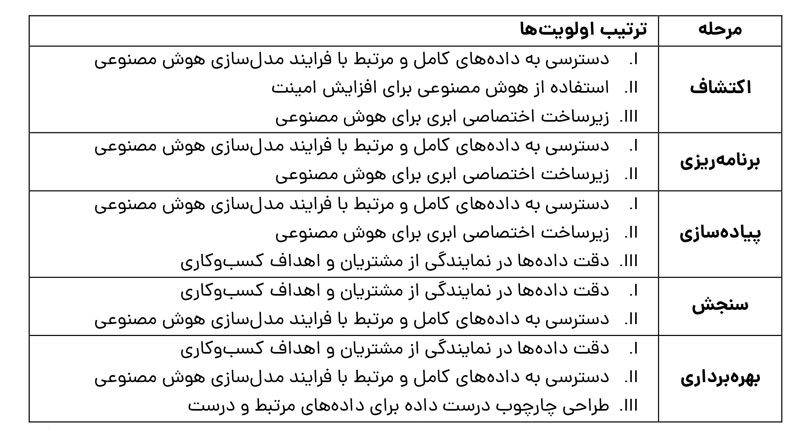 همانطور که در شکل 5 مشاهده میشود، نخستین اولویت در این زمینه دسترسی به دادههای با کیفیت است که در تمام مراحل مربوط به اکتشاف تا رشد و نمو و مقایس گیری قرار میگیرد؛ در مرحله بهرهبرداری و درک کامل از هوش مصنوعی اما داده با کیفیت به رتبه دوم اهمیت نزول پیدا میکند.