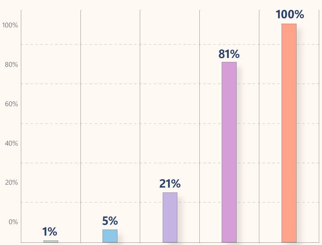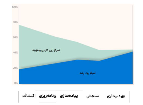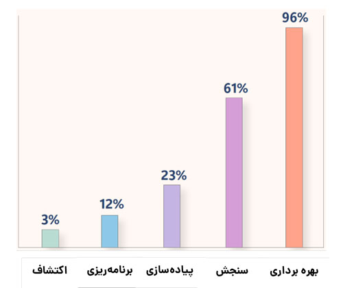 شکل 1 نشاندهنده ی درصد سازمانهایی است که در هر مرحله از فرایند استفاده از هوش مصنوعی توانسته اند که از آن خلق ارزش داشته باشند. تنها 3 درصد از مشارکت کنندگان در پژوهش در مرحله کشف هوش مصنوعی توانسته بودند که از این فناوری جدید ارزشآفرینی کنند؛ این در حالی است که در مرحله انتهایی یعنی ادراک کامل از هوش مصنوعی، این درصد به 96 هم رسیده است.